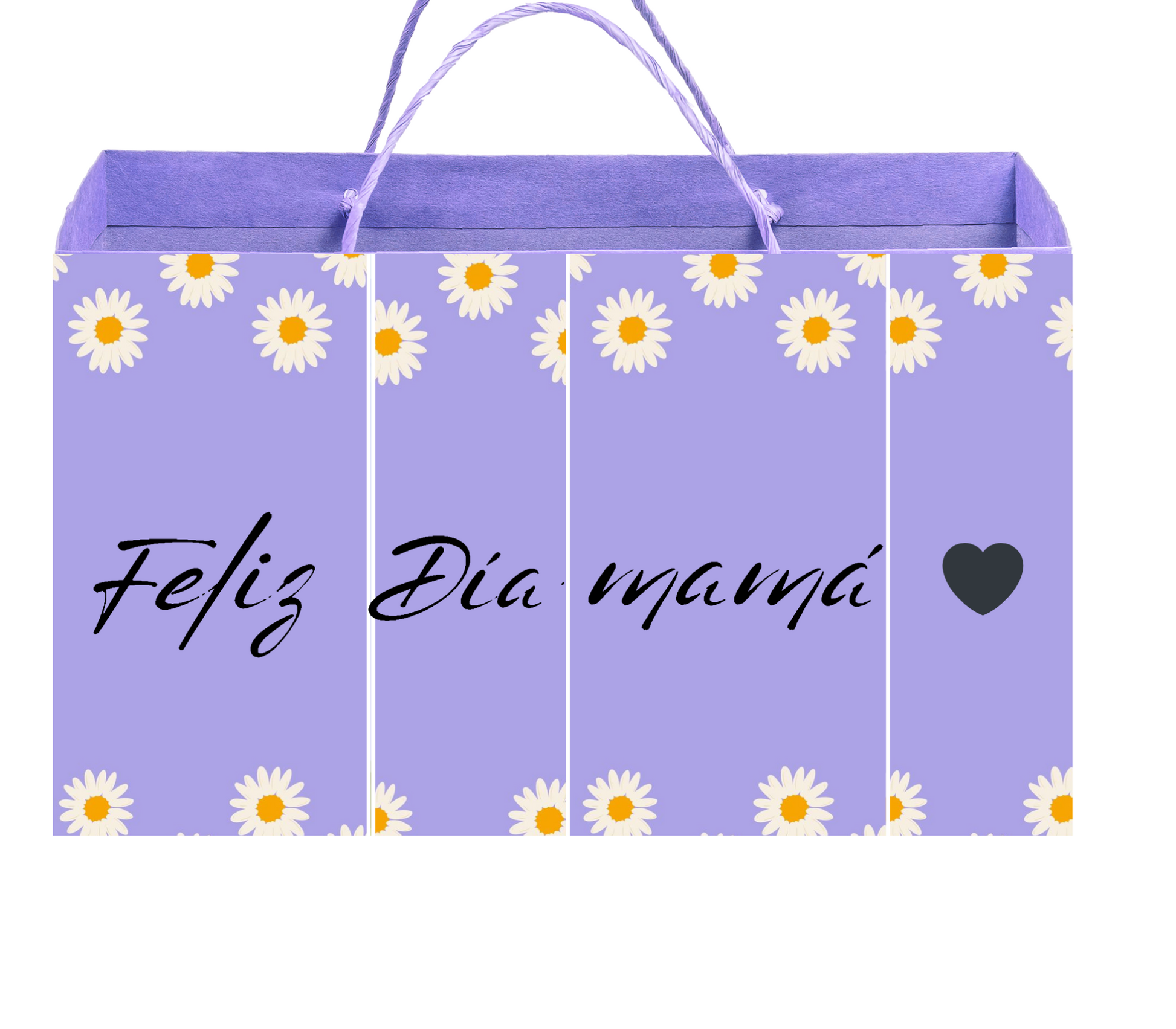 Hoja 1: frente y dorso de la bolsita con frase alusiva al Día de la Madre (“Feliz Día Mamá” "para la mejor Mamá "con flores/diseño).